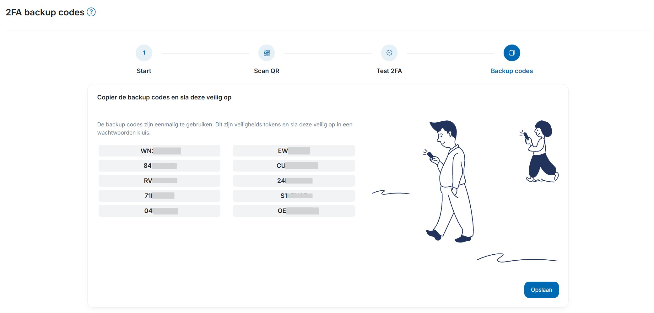 8) Je krijgt een overzicht aan back-up codes te zien. Sla deze back-up codes op een veilige plek op (zoals een wachtwoord-manager). Je hebt een van deze codes nodig wanneer je geen toegang hebt tot je account met de 2FA app. Klik op 'Opslaan'