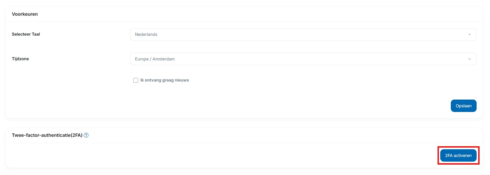 Ga naar de account instellingen. Onderaan de pagina staat de 2FA beveiligings optie. Hier kan deze 2FA geactiveerd worden.