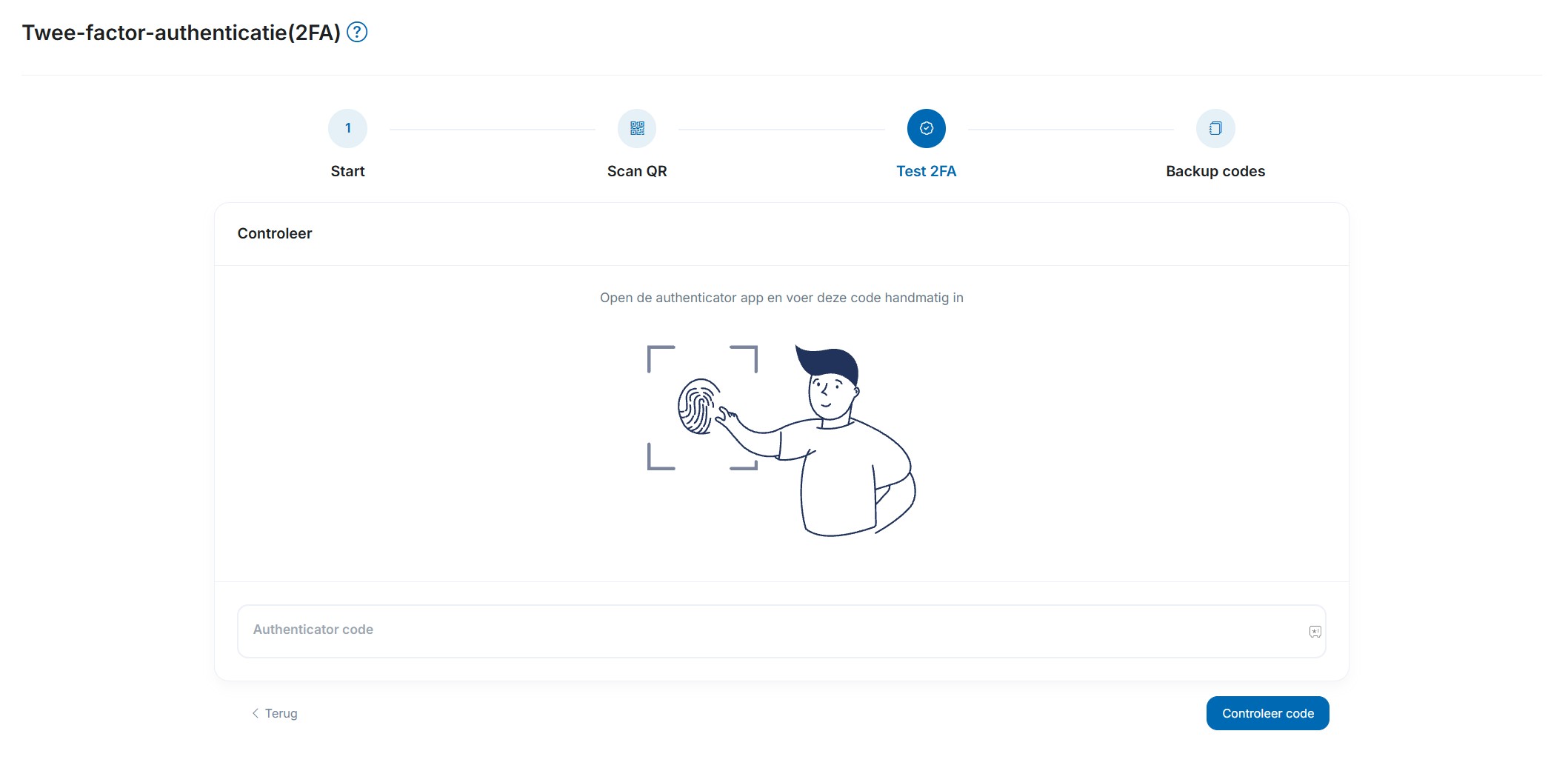 7) Vul de authenticator code in die zichtbaar is in je 2FA app. Klik op 'Controleer code'.