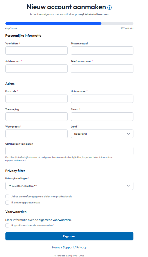 Nadat je jouw gegevens hebt ingevuld en de privacy-instellingen en voorwaarden hebt bekeken, kan je jouw PetBase account aanmaken door op de blauwe knop 'Registreer' te klikken. Je ontvangt nu een e-mail ter bevestiging dat het account is aangemaakt. Bewaar deze e-mail goed.
