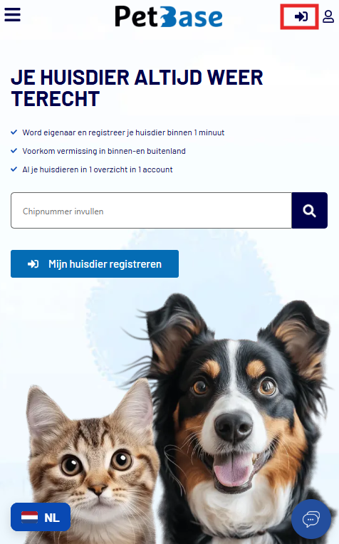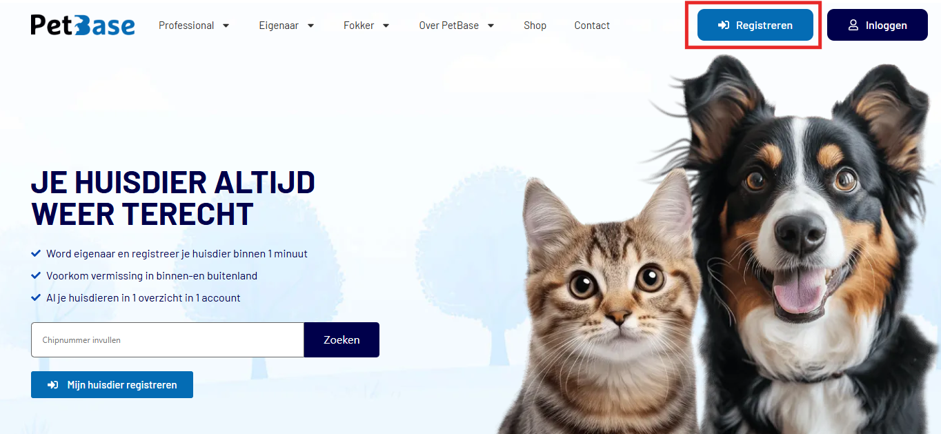 Hier kies je voor registreren. Hiermee begin je het proces van het aanmaken van jouw nieuwe PetBase account.