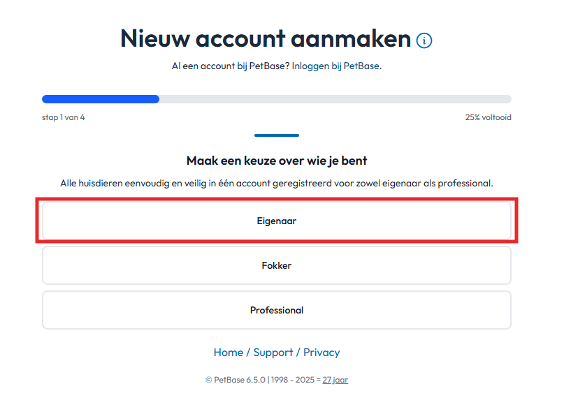 Wanneer je een PetBase account aanmaakt, begin je met aangeven of je een professional / fokker of een eigenaar bent. Je kiest nu het juiste formulier door aan te geven dat je een dier-eigenaar bent.