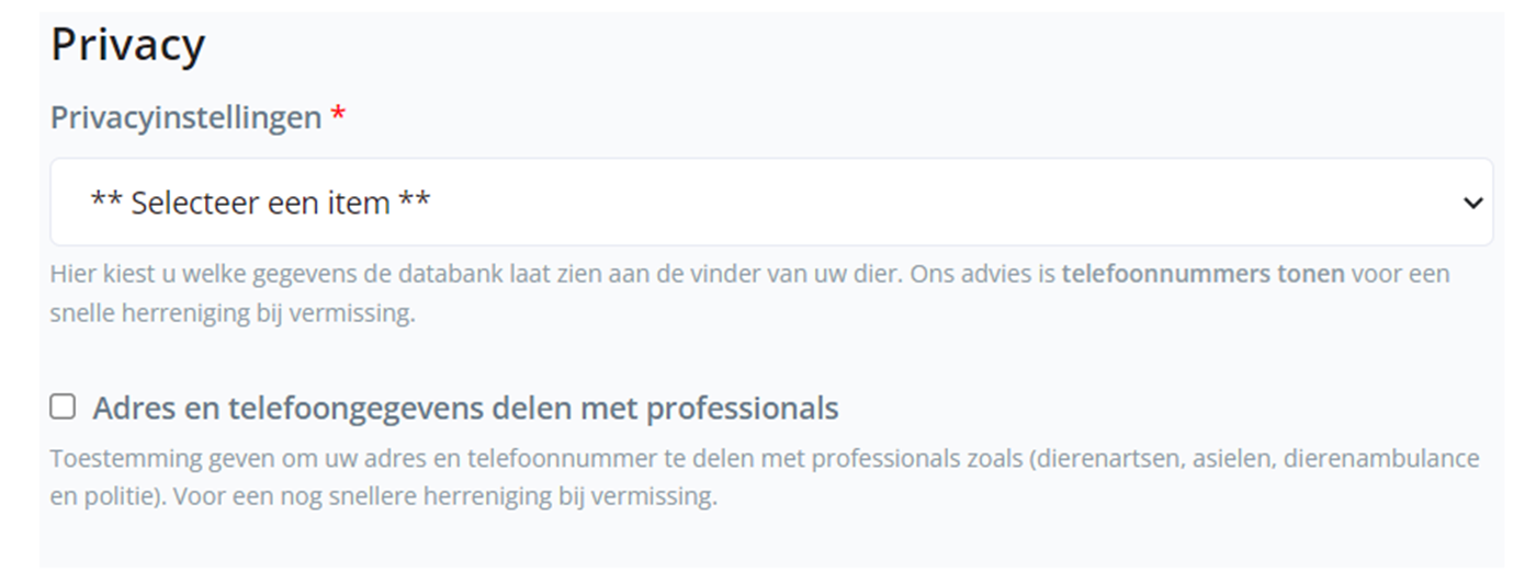 Nieuw: u heeft nu de extra mogelijkheid om toestemming te geven dat uw adres en telefoonnummer niet voor iedereen zichtbaar zijn, maar alleen voor professionals (dierenarts, asiel, politie en/of dierenambulance). Zo blijven uw contactgegevens veilig, maar kan uw dier bij vermissing wel sneller met u herenigd worden