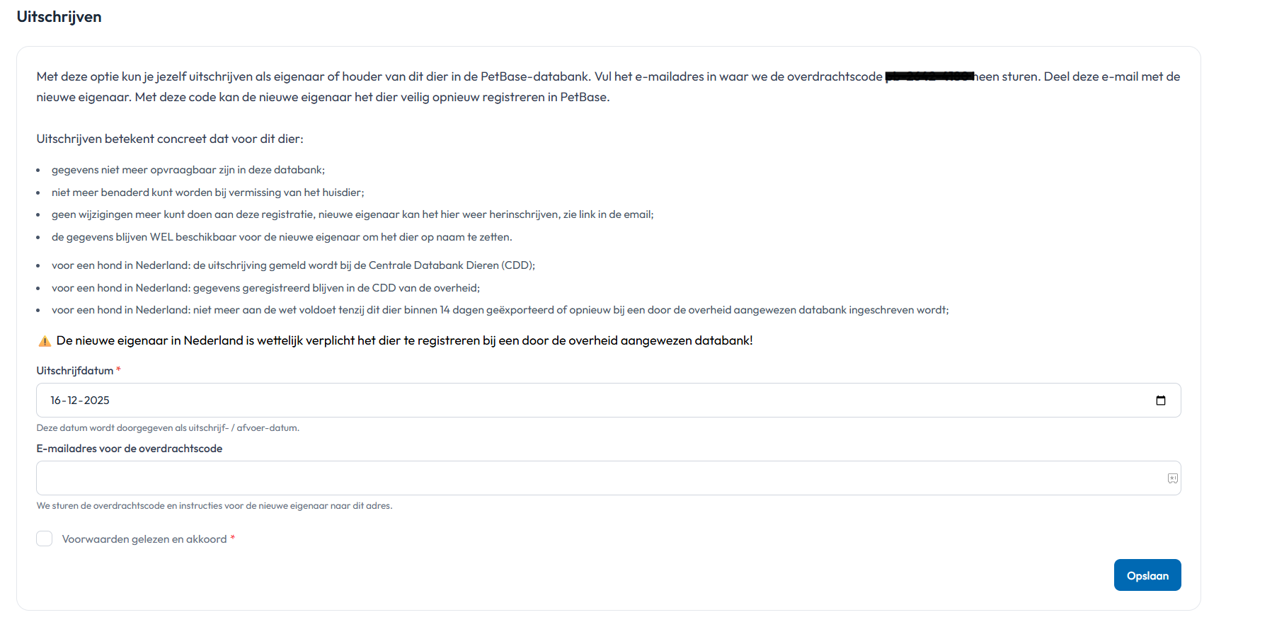 - Jouw naam, adresgegevens en andere contactgegevens worden verwijderd uit PetBase