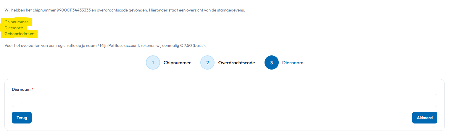 Bovenaan kun je controleren of de juiste gegevens van het dier zijn gevonden. Je ziet het chipnummer, de diersoort en de geboortedatum van het dier. Als de gegevens kloppen, kun je de naam van jouw dier invullen (of laten staan als deze al is ingevuld op basis van de eerder gegevens) en op 'Akkoord' klikken.