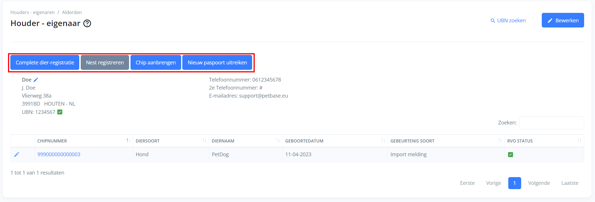 Als de eigenaar/houder nog geen account had krijgt deze direct na het aanmaken automatisch een e-mail van PetBase, waarin wij aangeven dat er een account voor ze is aangemaakt (AVG). Met dit account kunnen ze zelf hun account inzien en wijzigen (bv. bij verhuizing), dieren toevoegen, dieren vermist melden, een overdrachtscode aanmaken en nog meer.