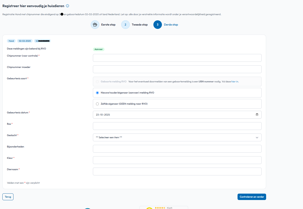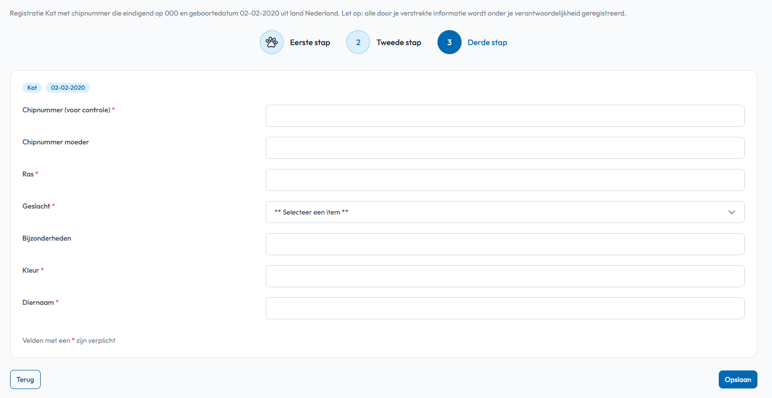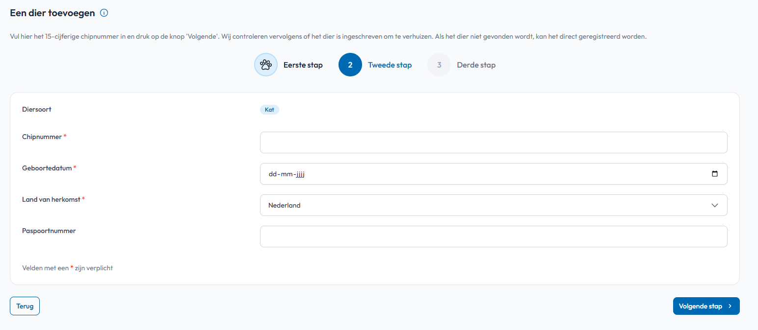 Vul hier het 15 cijferige chipnummer in van jouw dier. Let op: het zijn 15 cijfers, gebruik geen spaties, punten of letters voorafgaand aan, in of na het chipnummer. Controleer goed of het ingevulde chipnummer overeenkomt met het nummer in het dierenpaspoort of vaccinatiebewijs. Vul vervolgens de geboortedatum, het land van herkomst van het dier en (eventueel) het paspoortnummer in. Klik ten slotte op de knop 'Volgende stap'.