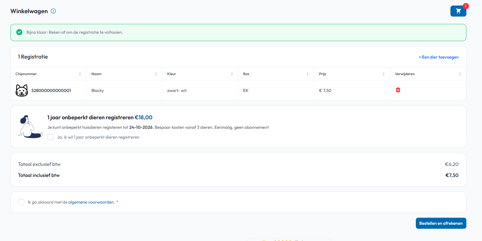 Je krijgt een overzicht te zien van de dieren die je gaat registreren. Via de knop '+Nieuw huisdier toevoegen' kan je meerdere dieren toevoegen aan je huidige bestelling. Ook kan je hier een