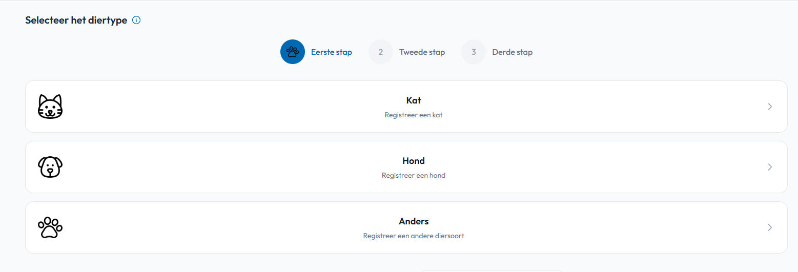 Kies dan het diersoort van het huisdier dat je als eerste wilt registreren.