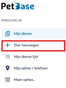Zodra je bent ingelogd in jouw (nieuwe) PetBase account, klik je links in het menu op 'Dier toevoegen'.