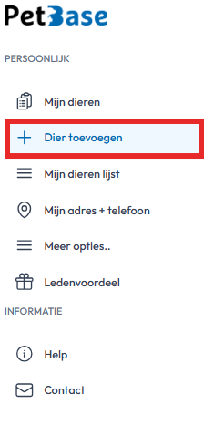 Zodra je bent ingelogd, kun je links in het menu op 'Dier toevoegen' klikken.