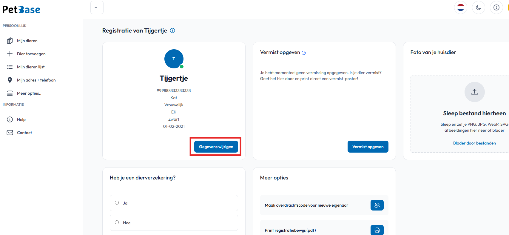 Als je klikt op 'Gegevens wijzigen', kun je nu eventuele wijzigingen toepassen (zoals bijvoorbeeld de roepnaam van jouw dier). Ook kun je een foto toevoegen onder 'Foto van je huisdier'.
