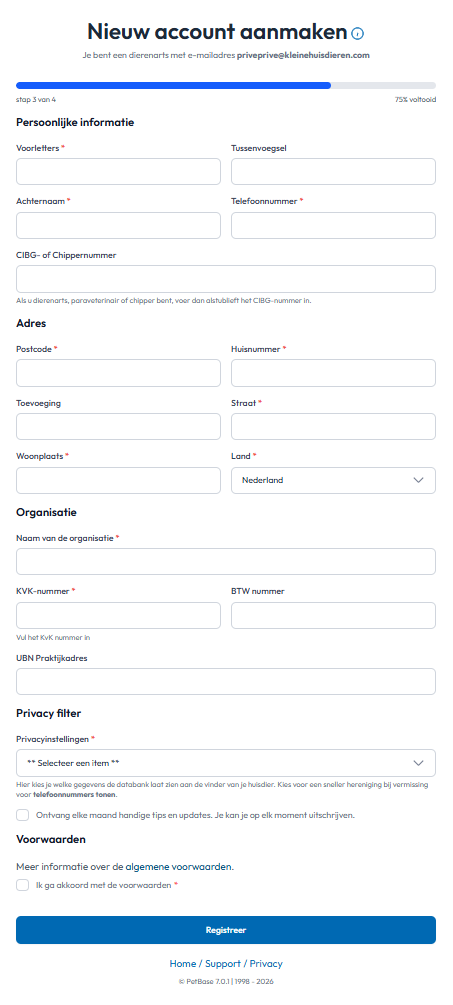 Zodra alle gegevens ingevuld zijn, kan je onderaan de pagina op 'Opslaan' klikken. Op dit moment gaat PetBase alle gegevens en wettelijke meldingen verwerken en versturen. In de eigenaar kaart zijn alle registraties terug te vinden. We verwerken op de achtergrond dus het kan zijn dat pas later de dieren en alle wettelijke meldingen beschikbaar zijn.